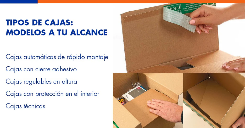 - Cajas con cierre adhesivo: ahorramos tiempo y cinta adhesiva para formar y cerrar la caja. Algunas tienen doble adhesivo y se suele utilizar con la intención de facilitar la posible devolución de los pedidos; así se puede reenviar el producto perfectamente. Este modelo tiene un cierre limpio y ofrece un importante ahorro a la hora del montaje.