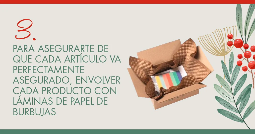 3. A continuación y para asegurarte de que cada artículo va perfectamente asegurado, será conveniente envolver cada producto con láminas de papel de burbujas. Cada paquete incluye 300 láminas. Aun así, también puedes optar por acolchar los productos con mallas tubulares de cartón.