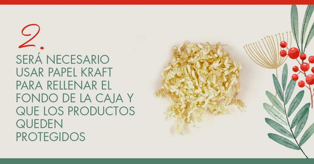 2. Seguidamente, será necesario usar papel kraft para rellenar el fondo de la caja y que los productos queden protegidos y sujetos. Se caracteriza por ser un producto muy resistente y opaco, con lo que preservará el interior a la perfección. Además, es perfecto para rellenar huecos en las cajas y con solo arrugarlo produce un gran volumen. Particularmente, para la fabricación de tus cajas de Navidad, te aconsejamos que adquieras virutas de papel, pues son ideales para completar y decorar tus productos y, por tanto, causarán un gran impacto. Al mismo tiempo, te ayudarán a acomodar los objetos delicados, como botellas de vino o botes de cristal.