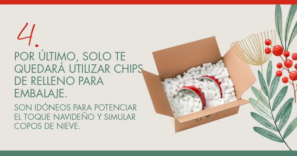 4. Por último, solo te quedará utilizar chips de relleno para embalaje. Estos elementos sostenibles son perfectos para rellenar los huecos del interior de las cajas y para acolchar. Puede que a primera vista no encuentres diferencias notables con las virutas citadas en el apartado anterior, pues el objetivo es prácticamente similar. Sin embargo, estos chips son idóneos para potenciar el toque navideño y simular copos de nieve. No obstante, queremos resaltar que ambos elementos de protección tienen un peso muy ligero, con lo que ayudan a ahorrar combustible en los transportes. Este dato es importante si tienes pensado enviar las cajas y no entregarlas en mano.