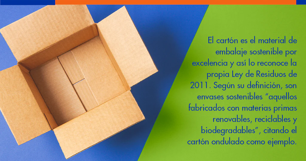 El cartón es el material de embalaje sostenible por excelencia y así lo reconoce la propia Ley de Residuos de 2011. Según su definición, son envases sostenibles “aquellos fabricados con materias primas renovables, reciclables y biodegradables”, citando el cartón ondulado como ejemplo.
