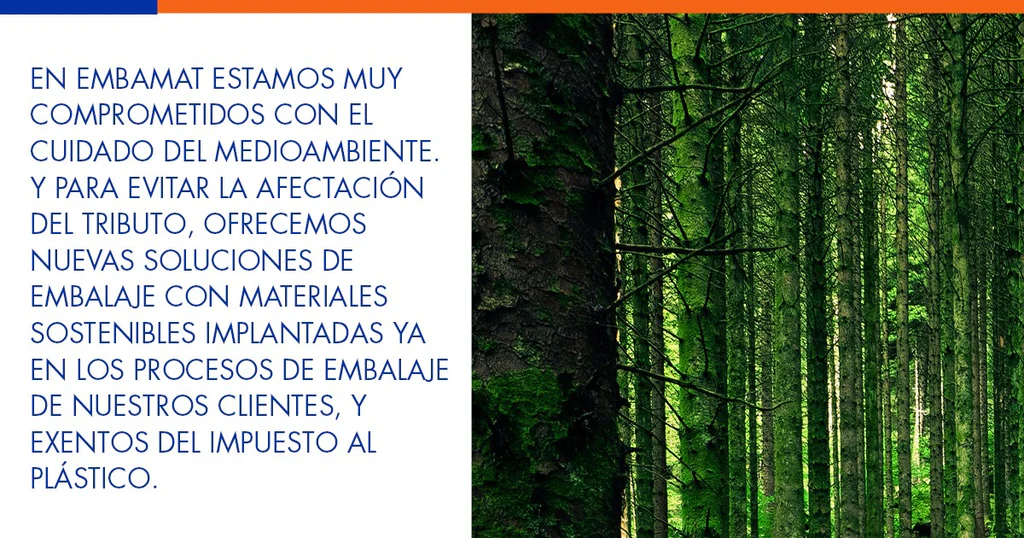 En Embamat estamos muy comprometidos con el cuidado del medioambiente. Y para evitar la afectación del tributo, ofrecemos nuevas soluciones de embalaje con materiales sostenibles implantadas ya en los procesos de embalaje de nuestros clientes, y exentos del impuesto al plástico, como son las cintas adhesivas de papel, porta documentos, bolsas de papel Kraft, fleje de plástico reciclado, espuma de protección y nuestras soluciones de relleno con cojines de aire para embalaje.