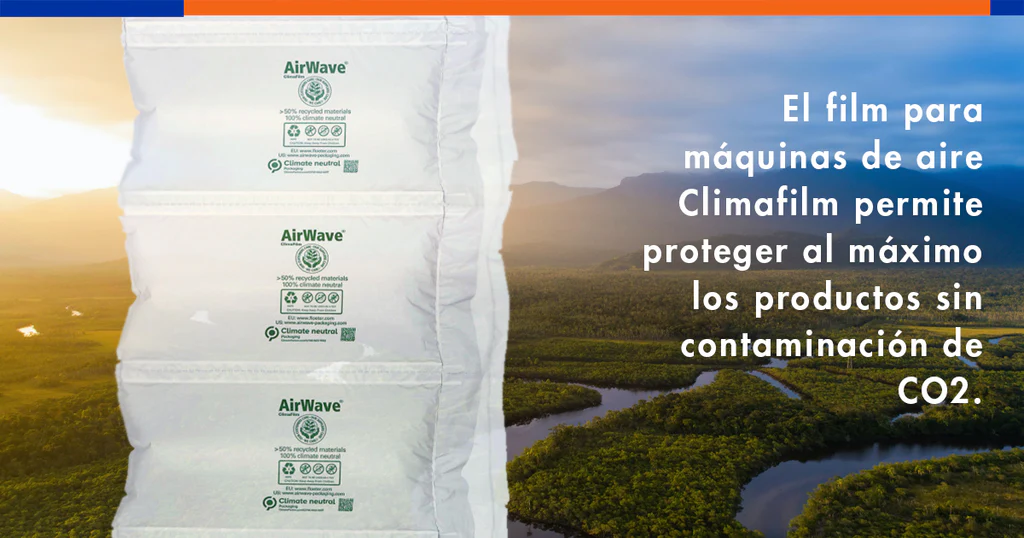 El film para máquinas de aire Climafilm permite proteger al máximo los productos sin contaminación de CO2. Se trata de almohadillas resistentes que funcionan como un cojín de aire que aporta seguridad y firmeza automática a los artículos que introducimos en la caja del embalaje.