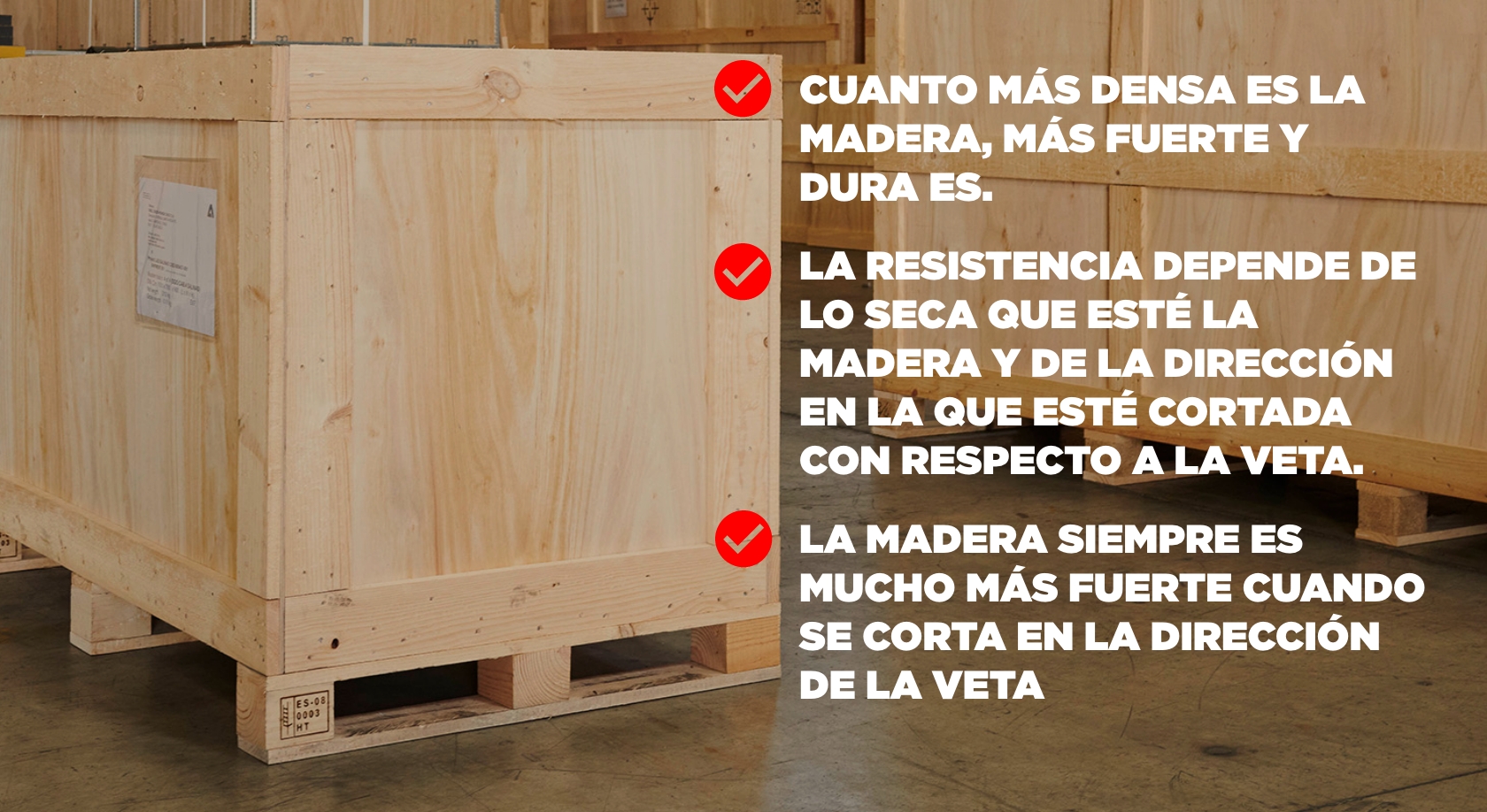 Para la construcción de embalajes de madera, el hecho de requerir unas tensiones admisibles (para la flexión, corte, compresión, etc.) conlleva controlar todos los parámetros que influyen en la resistencia de la madera. Así obtenemos un envase de madera con el mínimo material y que proporcione un coeficiente de seguridad necesario para la seguridad del producto que transporta.