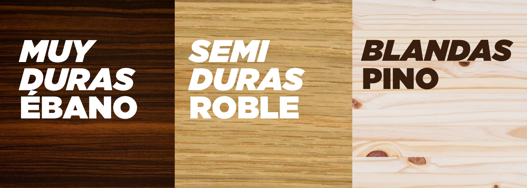 - Madera semidura: madera de roble · madera de fresno · madera de álamo · madera de acacia · madera de cerezo · madera de almendro · madera de castaño · madera de haya · madera de nogal