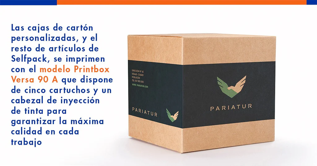Las cajas de cartón personalizadas, y el resto de embalajes de cartón, papel y madera de Selpack, se imprimen con el modelo Printbox Versa 90 A que dispone de cinco cartuchos y un cabezal de inyección de tinta para garantizar la máxima calidad en cada trabajo. Se usa tinta a base de agua ya que apenas contiene un 1 % de COVs (compuestos orgánicos volátiles).