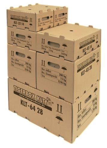 Contenedor de cartón diseñado bajo el estándar KLT (Klein-Ladungsträger), formato europeo normalizado específicamente desarrollado para la industria automotriz. Este sistema de embalaje cumple con las especificaciones técnicas más rigurosas del sector, ofreciendo dimensiones estandarizadas que garantizan integración perfecta en cadenas de suministro automotrices globales.