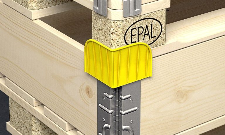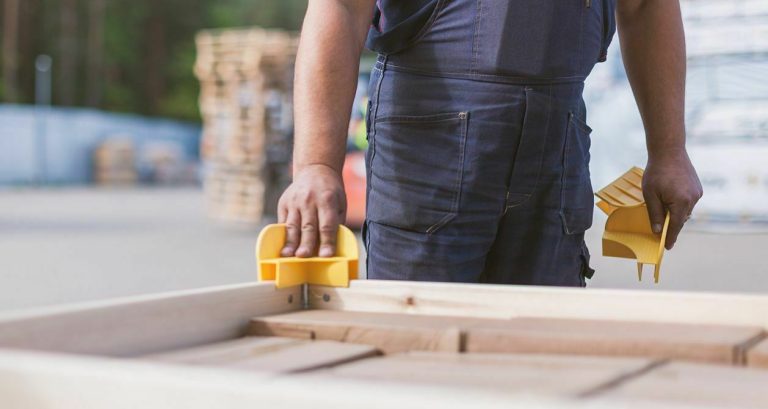 Las esquinas de plástico permiten apilar los cercos de madera en varios niveles, aportando estabilidad frente a desplazamientos y reduce el riesgo de caída debido al almacenamiento y transporte multinivel.