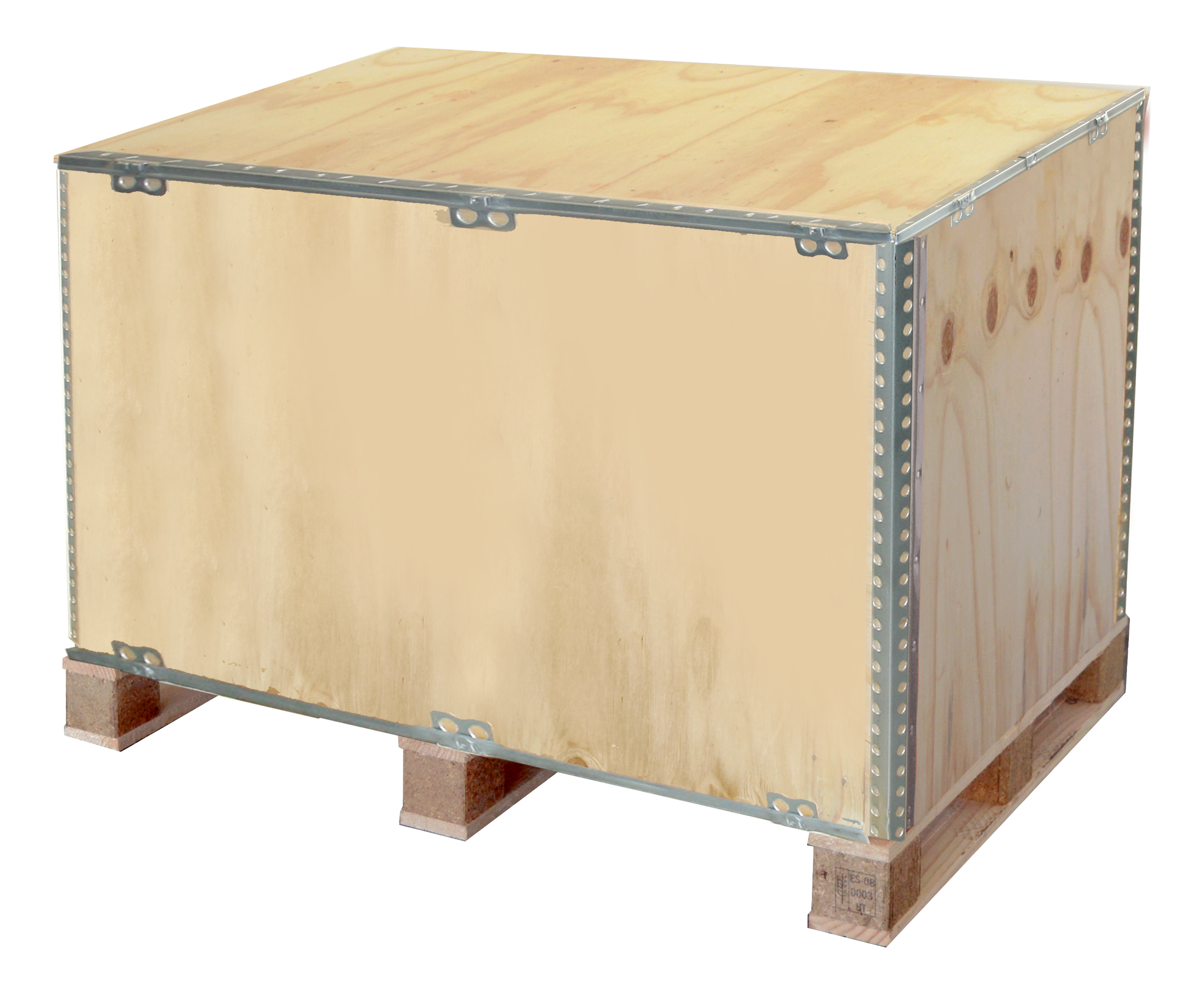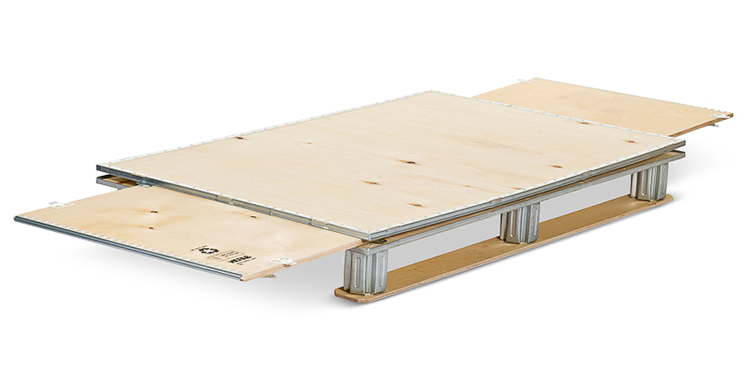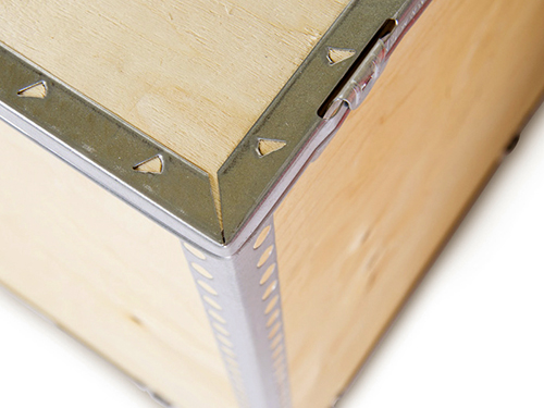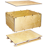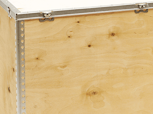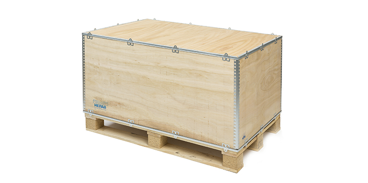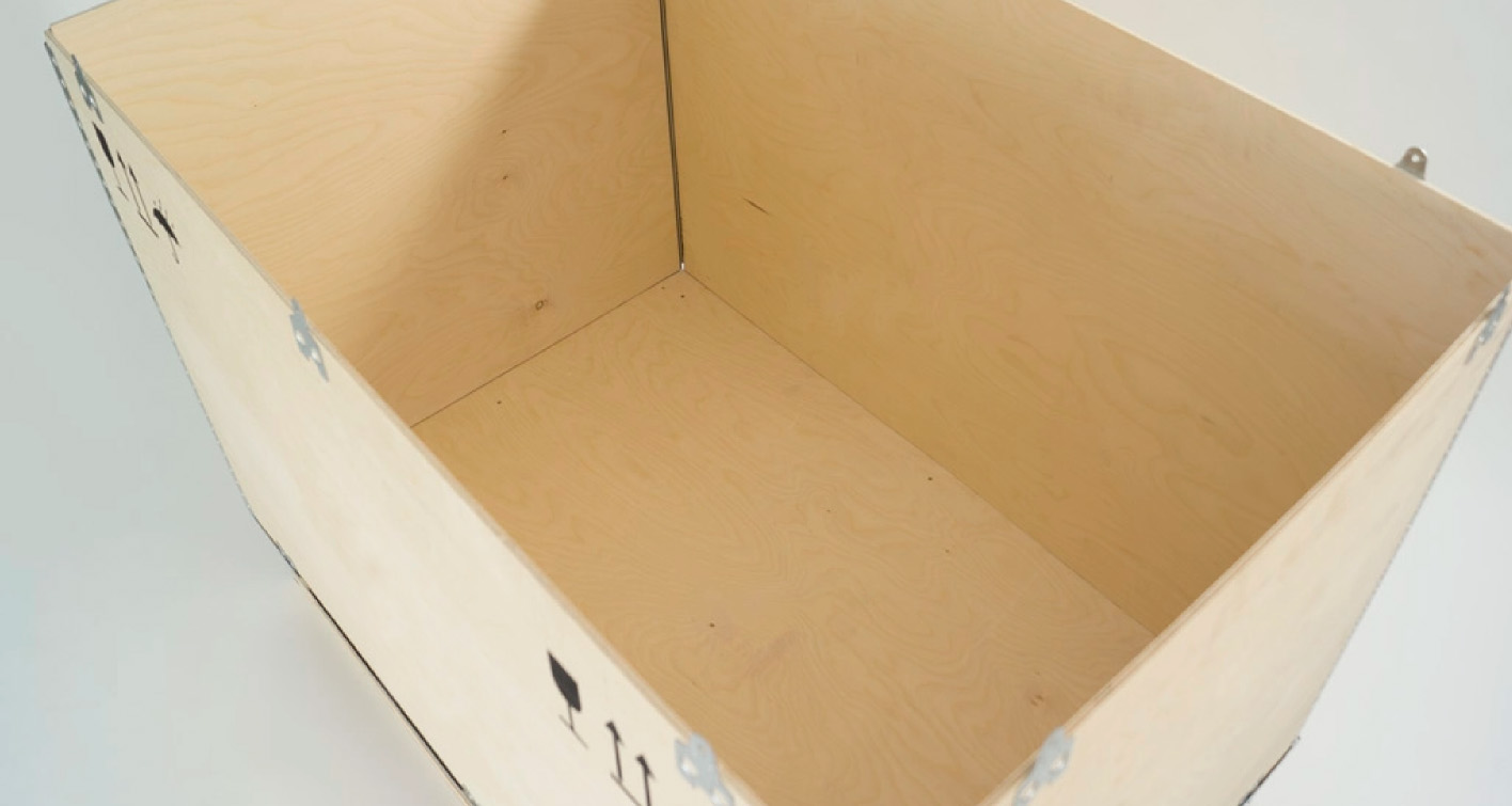 Caja de madera plegable ligera y resistente para embalaje industrial. Sistema sin clavos ni grapas que proporciona solución económica para envíos sin retorno, compatible con transporte terrestre, aéreo y marítimo.