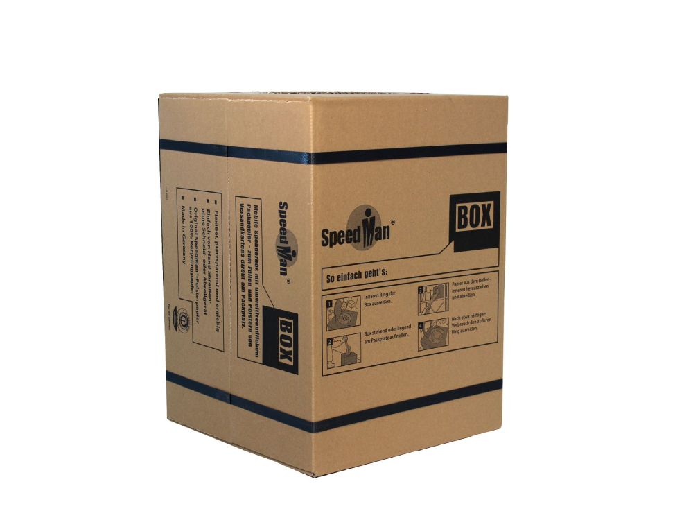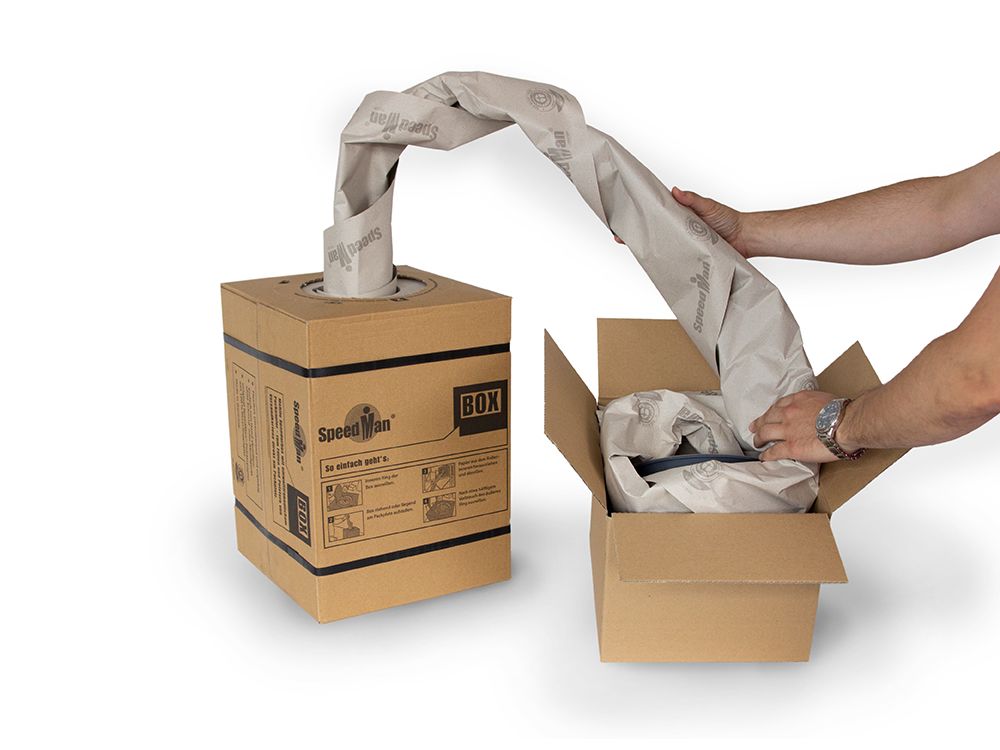 La caja dispensadora SpeedMan® Box se puede colocar en cualquier lugar, proporcionando total libertad operacional. Su uso resulta extremadamente sencillo: simplemente tire del papel y rellene el espacio alrededor del producto en la caja. Esta simplicidad elimina la necesidad de formación específica y permite una implementación inmediata en cualquier proceso de trabajo mediante esta solución autónoma.